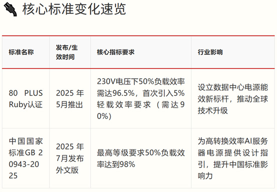 技术标准升级引领行业变革。2025年下半年,服务器电源行业迎来关键标准升级,旨在应对AI算力爆发式增长带来的高能耗挑战。全球范围内引入更严格的能效认证,中国在标准制定领域话语权显著提升。
