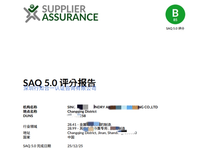近日深圳行知合一认证咨询有限公司协助国机铸锻机械有限公司通过SAQ 5.0评估达到85分B等级的结果 ,深圳行知合一专业老师经过前期对企业问卷的深入分析,以及针对问题进行查缺补漏及相关文件资料的完善,评估结果出来85分B等级的结果,助力企业满足了品牌商的要求。